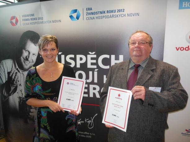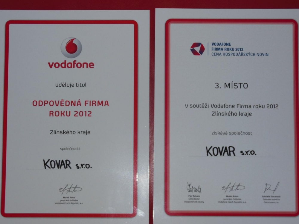 Am 11.10.2012 haben wir den 3. Platz beim Wettbewerb „Firma des Jahres der Region Zlín“ belegt. In der Kategorie „Verantwortungsvolles Unternehmen des Jahres 2012 der Region Zlín“, die von Vodafone ausgeschrieben wurde, konnten wir den 1. Platz erreichen. Die Jury würdigte nicht nur unseren verantwortungsvollen Umgang mit Mitarbeitern und Geschäftspartnern, sondern auch unser Engagement für den Umweltschutz und die Region, in der wir tätig sind.